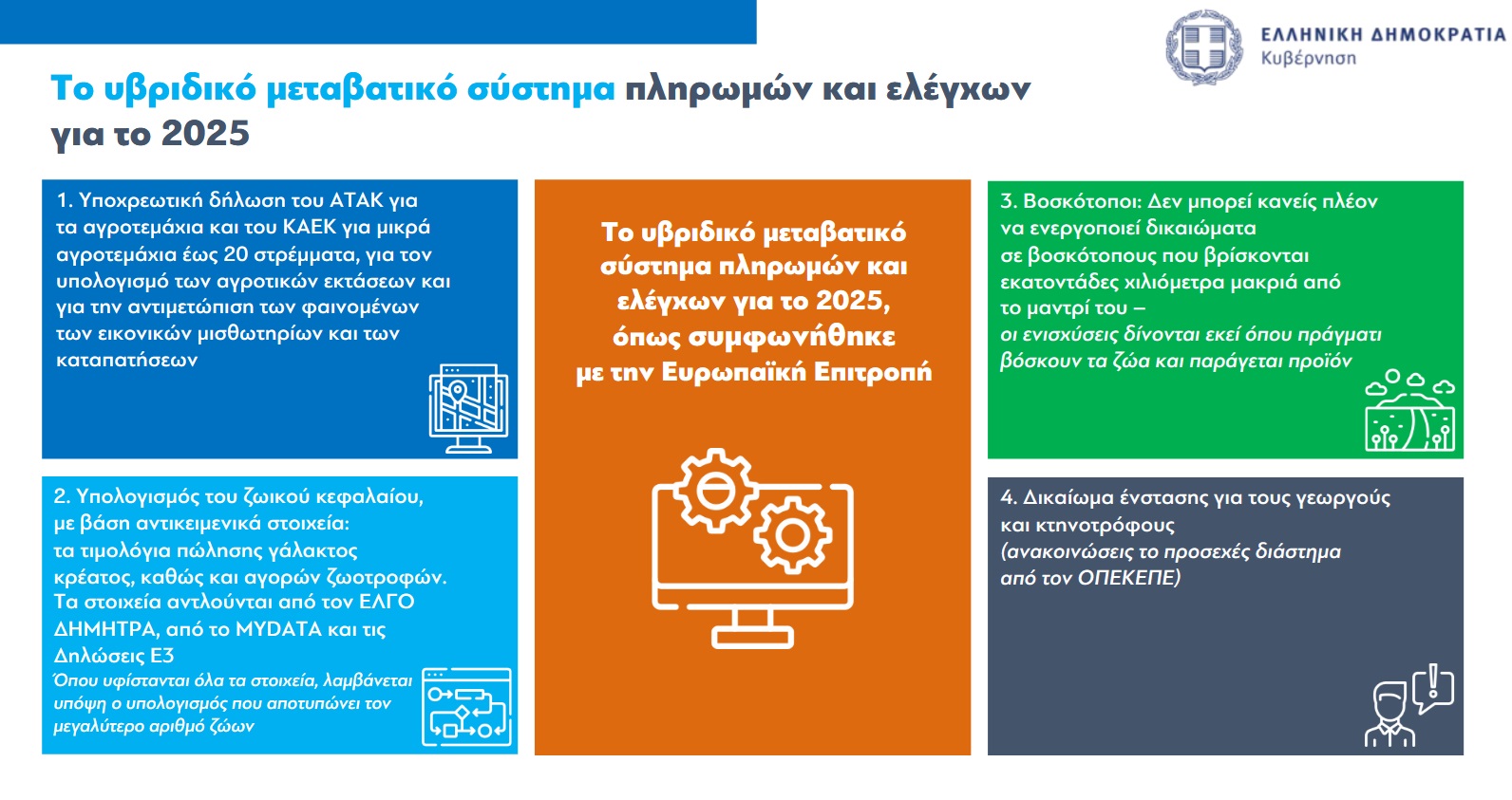 Το νέο σύστημα αποσκοπεί σε κοινωνική δικαιοσύνη, καθώς οι επιδοτήσεις θα βασίζονται σε αντικειμενικά, επαληθεύσιμα δεδομένα, με τους ειλικρινείς αγρότες να ωφελούνται από μια «δεύτερη κατανομή» των πλεοναζόντων πόρων. Για το 2025 εφαρμόζεται υβριδικό μεταβατικό σύστημα με υποχρεωτική δήλωση ΑΤΑΚ και ΚΑΕΚ, αυστηρότερους κανόνες για βοσκότοπους και υπολογισμό ζωικού κεφαλαίου με βάση τιμολόγια γάλακτος, κρέατος και ζωοτροφών.