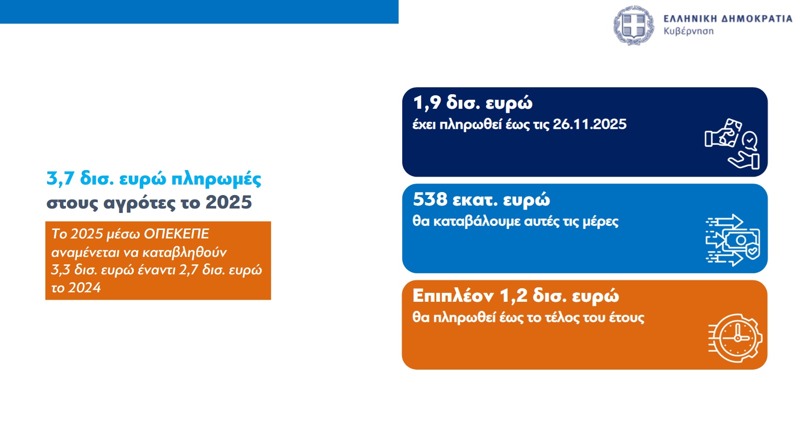 -Οι πληρωμές προς τους αγρότες από τον ΟΠΕΚΕΠΕ, το υπουργείο Αγροτικής Ανάπτυξης και Τροφίμων και από το υπουργείο Οικονομικών το 2025 θα φθάσουν συνολικά στα 3,7 δισεκ. ευρώ. Ειδικά από τον ΟΠΕΚΕΠΕ φέτος θα καταβληθούν 3,3 δις. ευρώ έναντι 2,7 δις. το 2024, δηλαδή 600 εκατ. περισσότερα.
