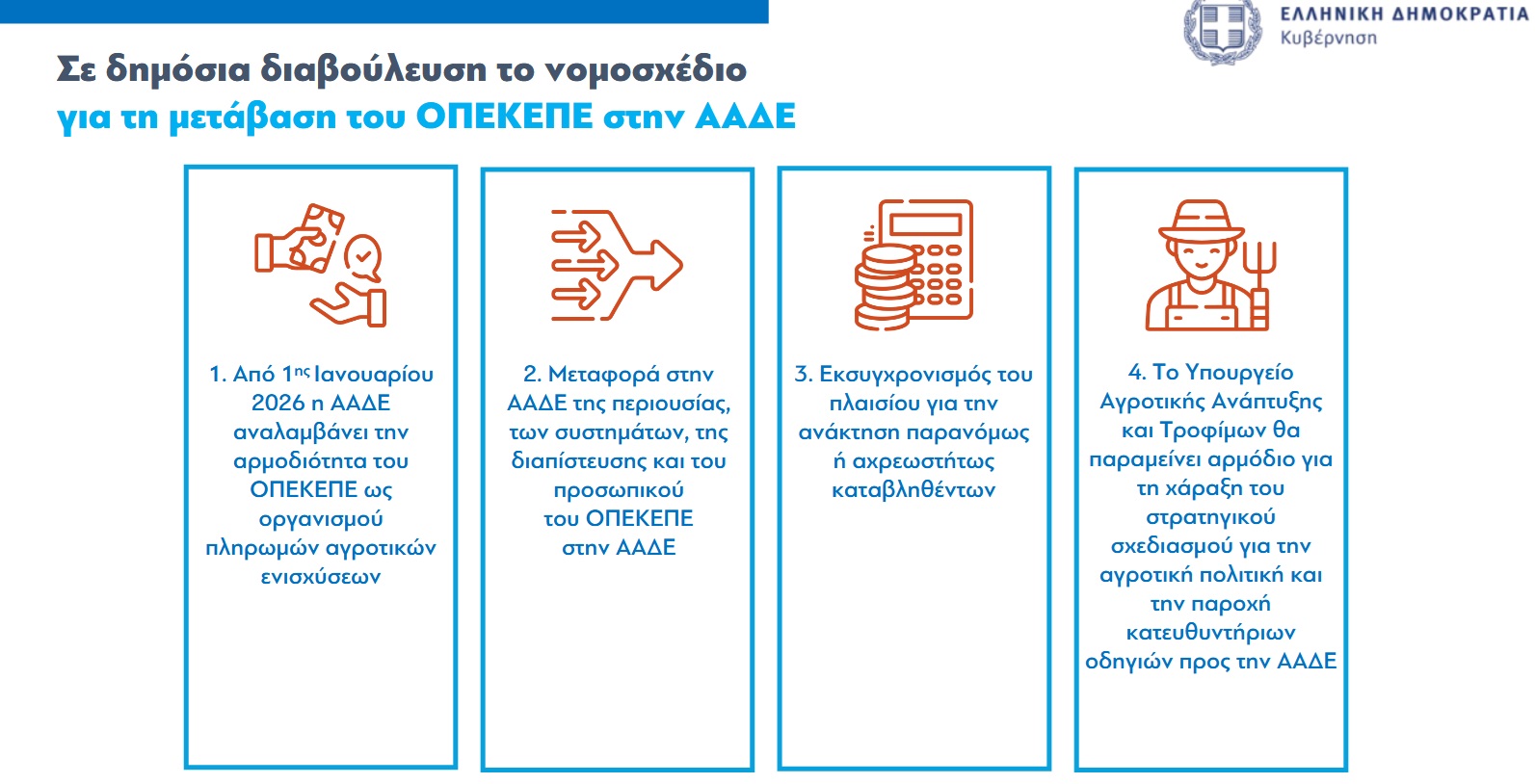 Όπως γνωρίζετε βρίσκεται σε δημόσια διαβούλευση το νομοσχέδιο για την μετάβαση του ΟΠΕΚΕΠΕ στην ΑΑΔΕ. Είναι το τρίτο στάδιο σε μια διαδικασία η οποία έχει ξεκινήσει ήδη από το καλοκαίρι.