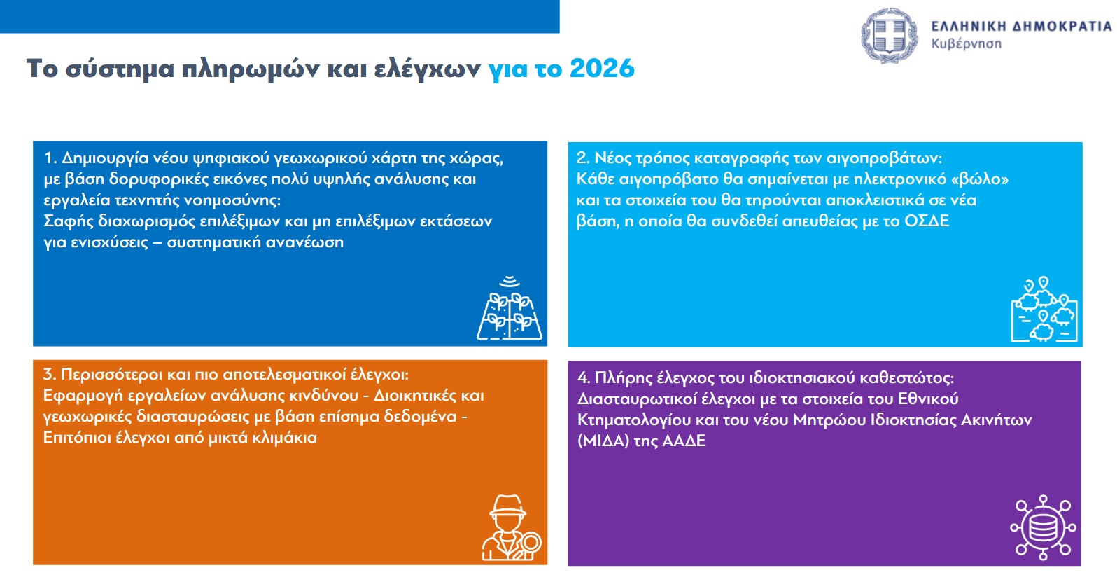 Επιτρέψτε μου να πω ορισμένα στοιχεία για το σύστημα πληρωμών και ελέγχων για το 2026. Πρώτον, δημιουργείται ένας νέος ψηφιακός γεωχωρικός χάρτης της χώρας με βάση δορυφορικές εικόνες πολύ υψηλής ανάλυσης και εργαλεία Τεχνητής Νοημοσύνης. Θα γίνεται ένας σαφής, διαχωρισμός επιλέξιμων και μη επιλέξιμων εκτάσεων για ενισχύσεις με συστηματική ανανέωση.
