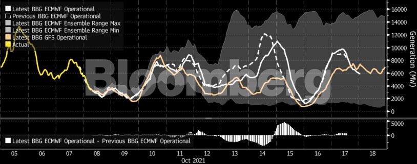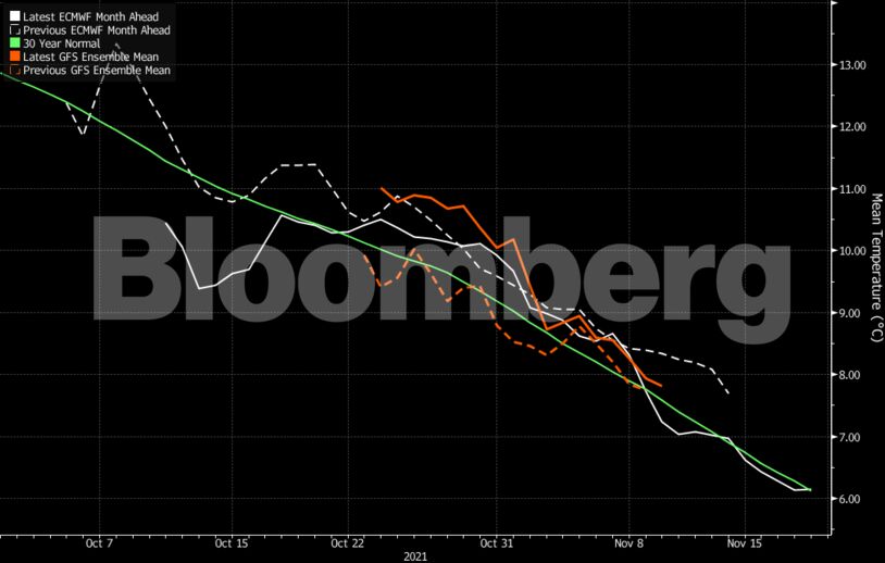 Η πρόβλεψη για τη βορειοδυτική Ευρώπη δείχνει ότι οι θερμοκρασίες θα υποχωρήσουν κάτω από τα κανονικά για την εποχή επίπεδα την επόμενη εβδομάδα και στη συνέχεια ξανά από τις 8 Νοεμβρίου, σύμφωνα με το μοντέλο του Bloomberg που χρησιμοποιεί τα δεδομένα της Weather Company. Η αιολική ενέργεια αναμένεται να μειωθεί σε χαμηλά επίπεδα την επόμενη εβδομάδα, συρρικνώνοντας τις προμήθειες, αφού η ζήτηση για θέρμανση είναι πιθανό να αυξηθεί.