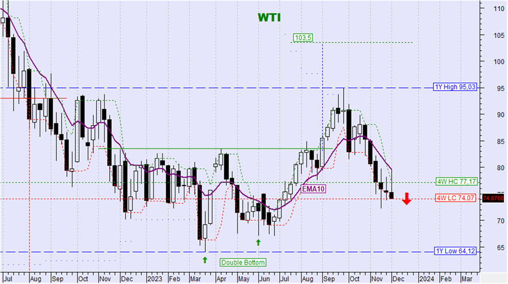 Σχόλιο εβδομάδας: Η τιμή του πετρελαίου συνέχισε με μία ακόμη καθοδική εβδομάδα και πέτυχε νέο χαμηλό κλείσιμο 4 εβδομάδων. Η τάση παραμένει καθοδική.