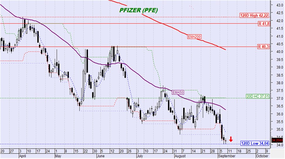 Η τιμή της μετοχής συνέχισε έντονα καθοδικά και πέτυχε νέο χαμηλό 120 ημερών στα 34,04$. Παραμένει υπό την μεμακρυσμένη πλέον πίεση του ΕΜΑ50 και διατηρεί την μεσοπρόθεσμη καθοδική τάση.
