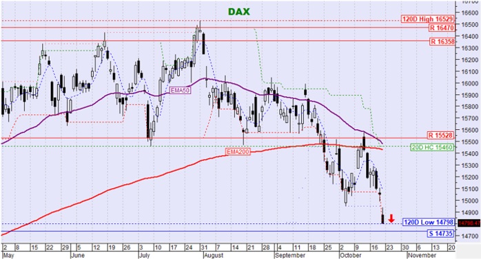 O δείκτης δεν κατάφερε να υπερβεί τους ΕΜΑ50 και ΕΜΑ200 αλλά αντίθετα κινήθηκε έντονα καθοδικά και πέτυχε νέο χαμηλό 120 ημερών στις 14798 μονάδες. Η μεσοπρόθεσμη τάση διατηρείται καθοδική.