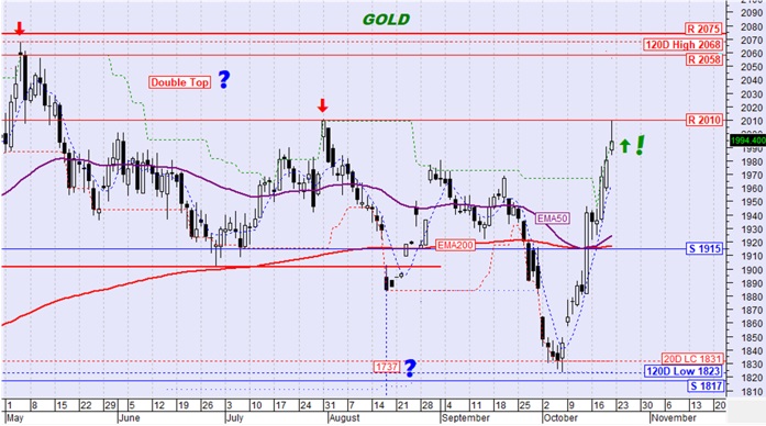 Η τιμή του χρυσού συνέχισε έντονα ανοδικά και μετά την ταυτόχρονη υπέρβαση των ΕΜΑ50 και ΕΜΑ200 πέτυχε και νέο υψηλό κλείσιμο 20 ημερών με αποτέλεσμα την μεταβολή της μεσοπρόθεσμης τάσης σε ανοδική. Τυπικά παραμένει ενεργός ο σχηματισμός διπλής κορυφής που έχει καθοδικό στόχο στα 1737$ αφού χρειάζεται απλά την υπέρβαση της αντίστασης στα 2010$ για να ακυρωθεί οριστικά.