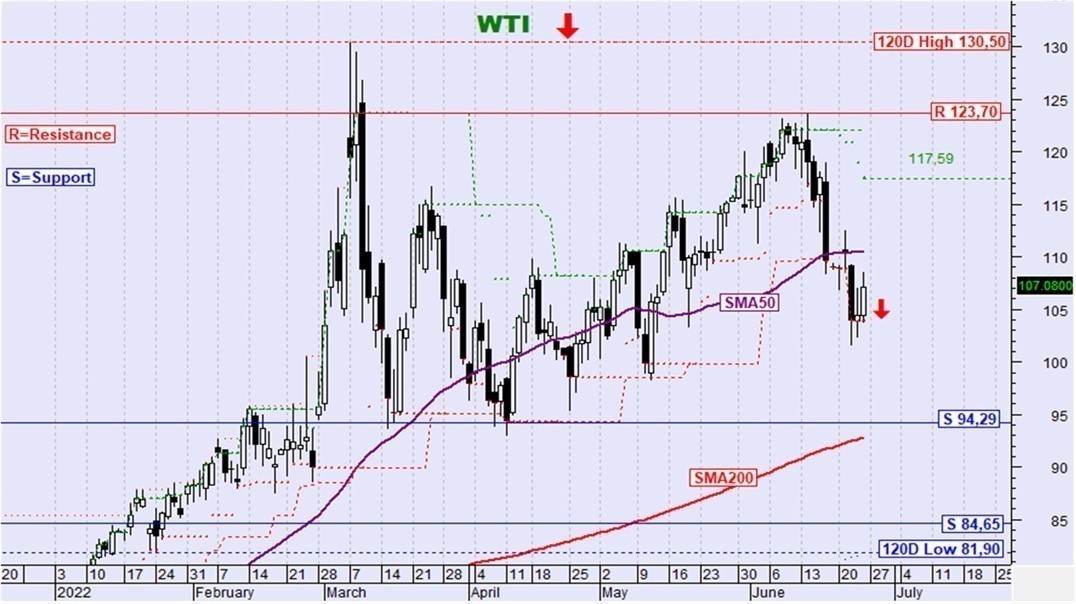 Ολοκληρώθηκε, τουλάχιστον προς το παρόν, η μεσοπρόθεσμη ανοδική κίνηση αφού η πίεση της αντίστασης στα 123,7$ έφερε μια διόρθωση της τιμής με αποτέλεσμα να χαθεί οριστικά και στήριξη του SMA50. Η διόρθωση μπορεί να συνεχιστεί προς τον SMA200 και την επόμενη στήριξη στα 94,29$ εκτός αν ανακτηθεί άμεσα ο SMA50.