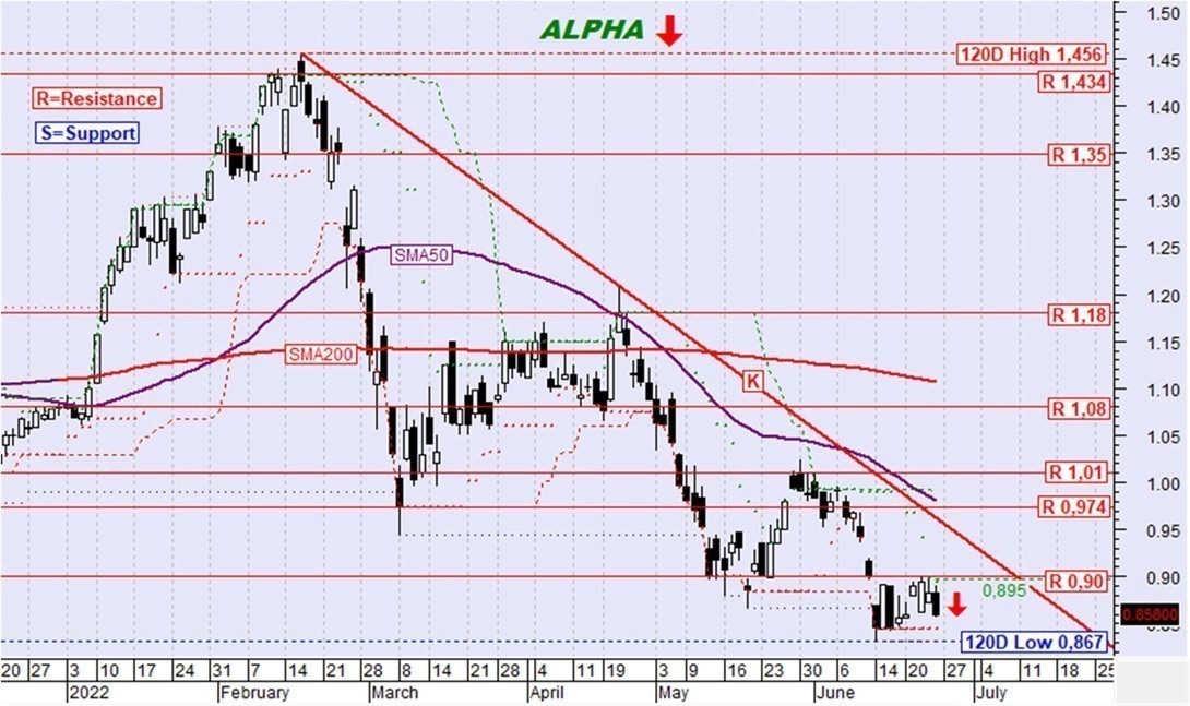 Η μετοχή απέτυχε να υπερβεί οριστικά το κάτω όριου του καναλιού Κ-Κ και να επιτρέψει εντός αυτού. Θα αναζητήσει στήριξη στο πρόσφατο χαμηλό 120 ημερών (1,992). Αν δεν πετύχει νέο χαμηλό 120 ημερών και αντιδράσει ανοδικά η τεχνική εικόνα βελτιώνεται με υπέρβαση των 2,105€, όμως είναι αρκετά πιθανό να συνεχίσει χαμηλότερα με επιτάχυνση της καθόδου προς τον μακροπρόθεσμο καθοδικό στόχο στα 1,74€.