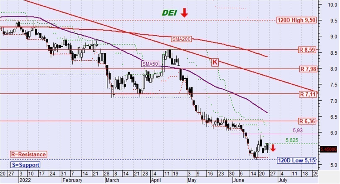 Η μετοχή συνεχίζει την διορθωτική της πορεία παρά την ανοδική αντίδραση στην αρχή της περασμένης εβδομάδας. και πέτυχε ξανά νέο χαμηλό 120 ημερών. Δεν έχει αλλάξει η τεχνική εικόνα η οποία είναι ιδιαίτερα επιβαρυμένη. Η κίνηση της τιμής θα διατηρήσει την καθοδική ορμή σε περίπτωση επίτευξης νέου χαμηλού 120 ημερών διατηρώντας ακέραιες τις πιθανότητες επίτευξης του μακροπρόθεσμου στόχου στα 4,60€. Σε περίπτωση που δεν σημειωθεί νέο χαμηλό 120 ημερών η τεχνική εικόνα βελτιώνεται μόνο με υπέρβαση των 5,93€.