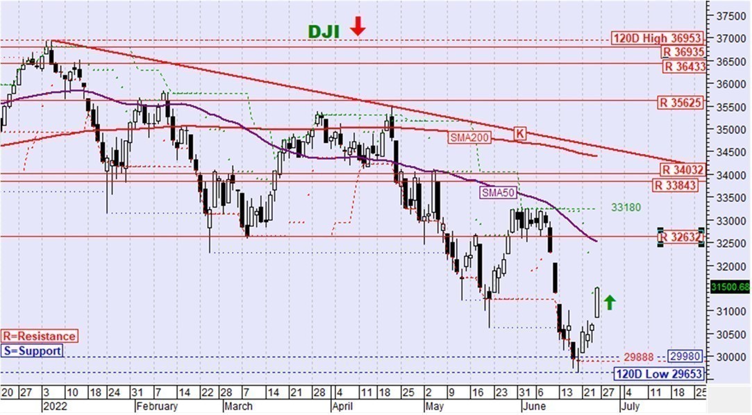 Ο δείκτης αφού έχασε τη στήριξη στο επίπεδο των 32632 μονάδων, σχεδόν κατέρρευσε προς επίτευξη του μακροπρόθεσμου καθοδικού στόχου στην περιοχή των 29500 μονάδων σημειώνοντας φυσικά και νέο χαμηλό 120 ημερών (29653). Στη συνέχεια όμως εκδήλωσε μια έντονη ανοδική αντίδραση με αποτέλεσμα την αντιστροφή της βραχυπρόθεσμης τάσης.