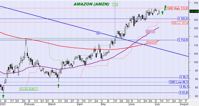 Η μετοχή συνέχισε ανοδικά και πέτυχε ξανά νέο υψηλό 120 ημερών (131,8$). Παραμένει ενεργός ο μεγάλος σχηματισμός διπλού πυθμένα που έχει μεσοπρόθεσμο στόχο στην περιοχή των 145$.