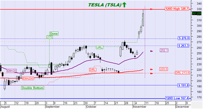 Στηρίξεις που ωθούν/μπορούν να ωθήσουν την τιμή ανοδικά: ο Εκθετικός Μέσος Όρος των 30 ημερών (ΕΜΑ30) στα 252,1$, ο Εκθετικός Μέσος Όρος των 200 ημερών (ΕΜΑ200) στα 220,0$ και το όριο μεταβολής της μεσοπρόθεσμης τάσης στα 213,6$