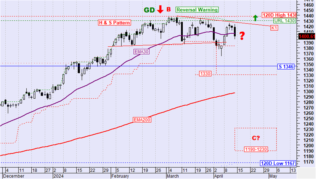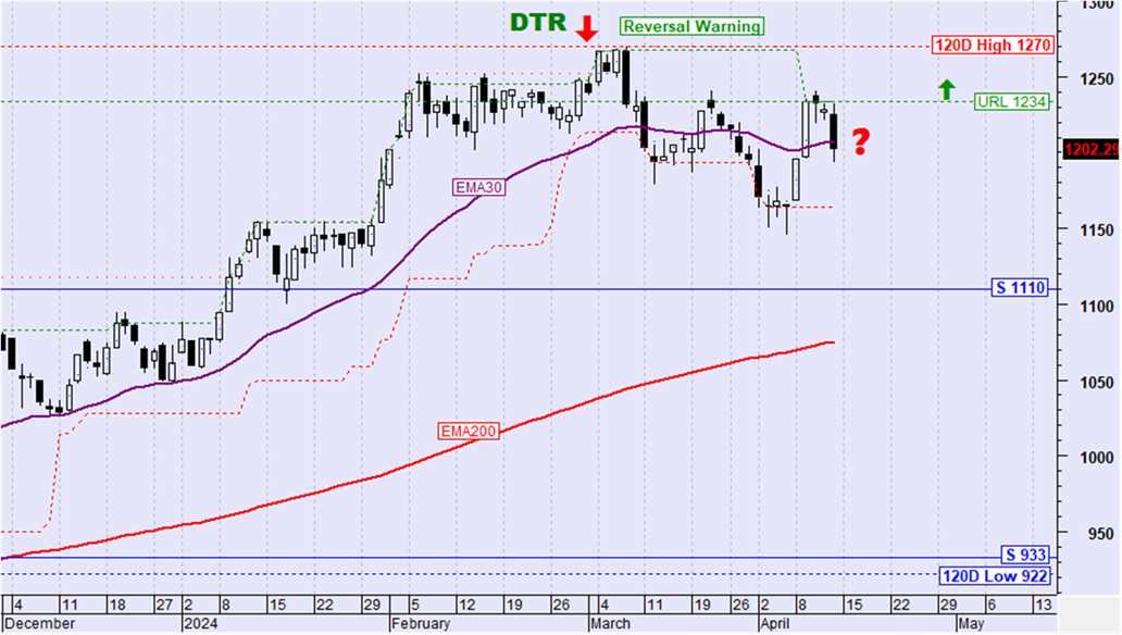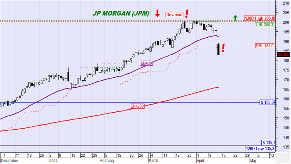 Ο δείκτης S&P500 διόρθωσε έντονα και διέσπασε καθοδικά τον ΕΜΑ30 στο κλείσιμο της εβδομάδας. Χρειάζεται μόλις μία ακόμη συνεδρίαση με τιμή κλεισίματος χαμηλότερα του ΕΜΑ30 (ακόμη και ανοδική) για να ενεργοποιήσει προειδοποίηση αντιστροφής της μεσοπρόθεσμης τάσης σε καθοδική.