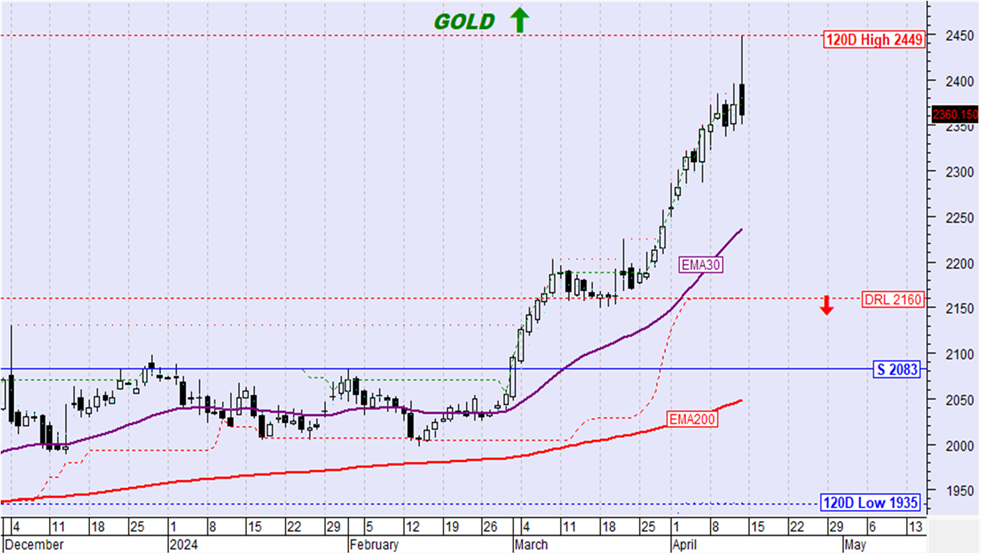 Η τιμή του χρυσού συνέχισε ανοδικά και την περασμένη εβδομάδα. Στην τελευταία συνεδρίαση πέτυχε ξανά νέο υψηλό 120 ημερών στα 2449$ στο υψηλό ημέρας όμως στη συνέχεια υποχώρησε έντονα κλείνοντας με αρνητικό πρόσημο.