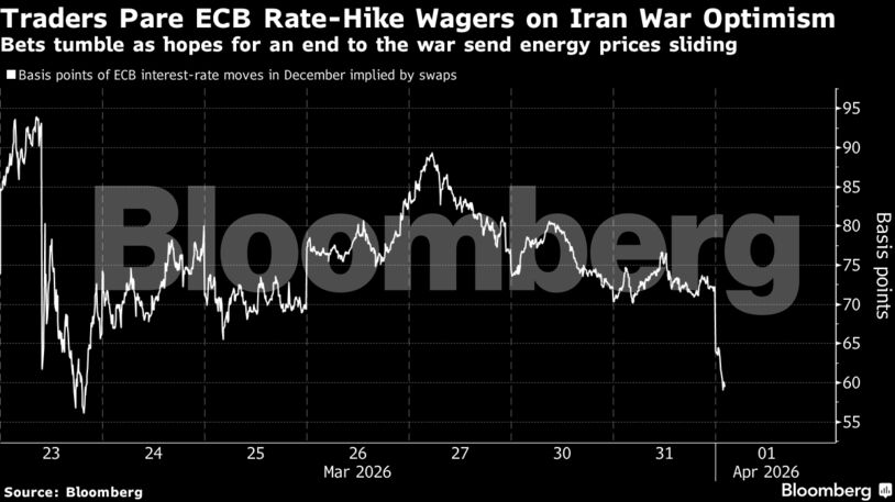 Η πιθανότητα αύξησης επιτοκίων τον Απρίλιο έχει πλέον μειωθεί περίπου στο 50% για την Ευρωπαϊκή Κεντρική Τράπεζα και στο 40% για την Τράπεζα της Αγγλίας. Σε ετήσια βάση, οι αγορές προεξοφλούν αυστηροποίηση της νομισματικής πολιτικής κατά περίπου 60 και 43 μονάδες βάσης αντίστοιχα — τα χαμηλότερα επίπεδα από τα μέσα του περασμένου μήνα.