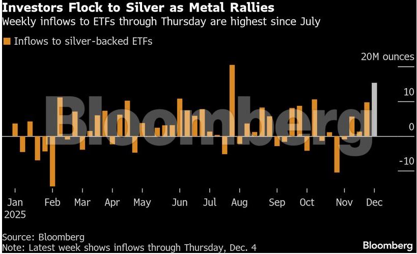 Οι συνολικές προσθήκες σε ETF τις τέσσερις ημέρες έως την Πέμπτη, είναι ήδη οι υψηλότερες για οποιαδήποτε ολόκληρη εβδομάδα από τον Ιούλιο, γεγονός που καταδεικνύει την όρεξη των επενδυτών, παρά τις ενδείξεις ότι τα κέρδη του ασημιού μπορεί να εμφανίζονται υπερβολικά.
