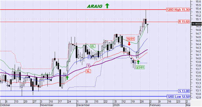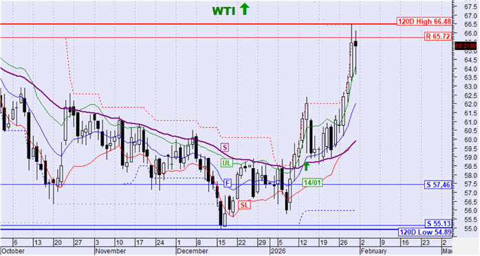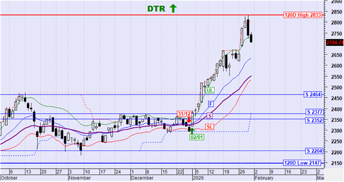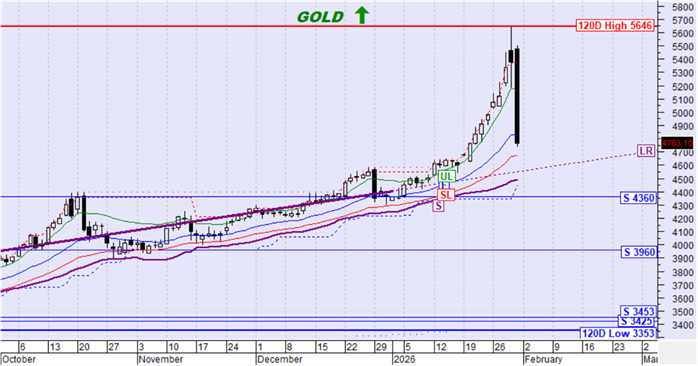 Ο χρυσός μετά την επίτευξη νέου υψηλού 120 ημερών (και ιστορικού υψηλού) κινήθηκε έντονα διορθωτικά χωρίς σηματοδότηση. Η τιμή παραμένει ψηλότερα της SL και του αργού κινητού μέσου όρου S έτσι διατηρείται η ανοδική τάση. Η τιμή του χρυσού αν και φαίνεται να πέφτει άσχημα στην ουσία διορθώνει από την υπερβολή τoυ Ιανουαρίου, επιστρέφοντας στην ευθεία LR που αποτελεί τη μέση τιμή του τελευταίου τριμήνου του 2025 (γραμμική παλινδρόμηση των τιμών).