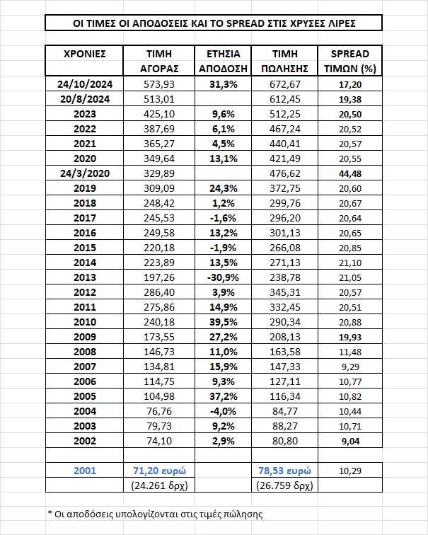 Από την άλλη πλευρά, εάν το spread του 20,5% προβληθεί στη χθεσινή τιμή αγοράς, τότε η τιμή πώλησης της λίρας θα διαμορφωνόταν στα 691,59 ευρώ. Όμως, με τα νέα δεδομένα η λίρα πουλιέται από την Τ.τ.Ε 18,92 ευρώ χαμηλότερα.