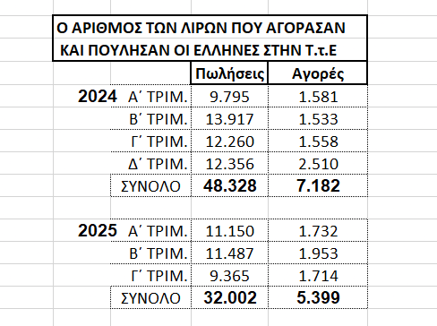 Στο χρονικό διάστημα του 9μηνου, ο αριθμός των λιρών που ρευστοποιήθηκαν ήταν 5,9 φορές μεγαλύτερος από εκείνον των αγορών. Ενώ στο 9μηνο του 2024 η δύναμη των πωλητών ήταν κατά 7,7 φορές πολλαπλάσια των αγοραστών.