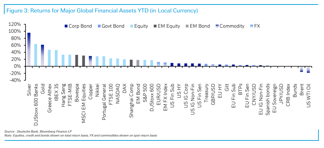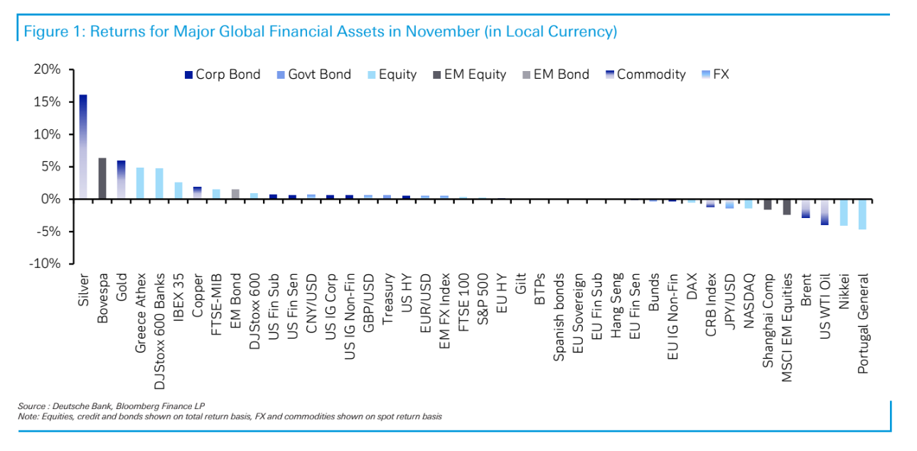 Σύμφωνα με τα στοιχεία της Deutsche Bank, οι ισχυρότεροι κερδισμένοι του Νοεμβρίου ήταν τα πολύτιμα μέταλλα, με το ασήμι να εκτοξεύεται κατά +16%, ενώ ο χρυσός κινήθηκε επίσης ανοδικά με +5,9%. Στις μετοχικές αγορές, από τις θετικές εκπλήξεις ξεχώρισε η Βραζιλία (Bovespa), καταγράφοντας ισχυρή άνοδο, ενώ στην Ευρώπη, η Ελλάδα συγκαταλέγεται στις κορυφαίες αποδόσεις του μήνα.