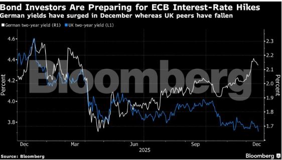 Οι αποδόσεις των γερμανικών διετών ομολόγων, ο δείκτης αναφοράς για την περιοχή του ευρώ, αυξήθηκαν περίπου 10 μονάδες βάσης αυτόν τον μήνα, λόγω της πιθανής ανανεωμένης αυστηρότητας από την ΕΚΤ.