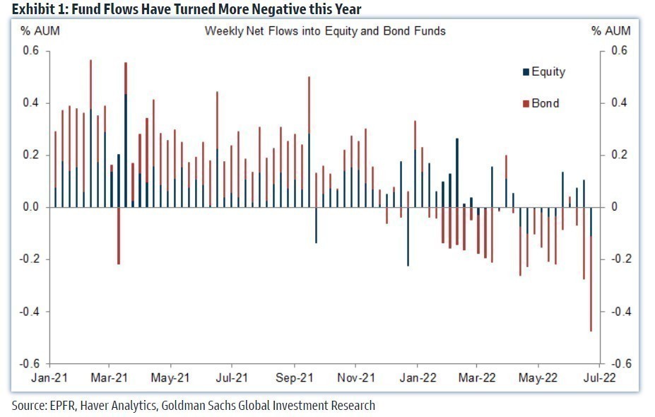 «Οι επενδυτές ”τραβάνε” χρήματα από τις αγορές κεφαλαίου και έχουν αρχίσει να αντιστρέφουν τις τοποθετήσεις που είχαν κάνει από τα τέλη του 2020 έως το 2021 οι οποίες οδήγησαν στην ανάκαμψη της αγοράς των μετοχών και των ομολόγων από τα χαμηλά επίπεδα της πανδημίας», εξηγεί η Goldman Sachs. Φέτος, ειδικά τα μετοχικά και τα ομολογιακά αμοιβαία κεφάλαια, έχουν αρχίσει να βλέπουν εκροές, με βάση τα στοιχεία του EPFR.
