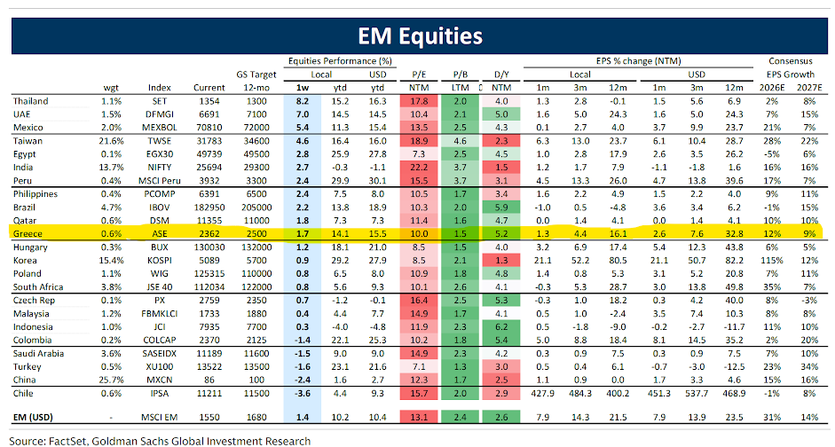 Η τοποθέτηση αυτή συνδέεται με τη συνολική στρατηγική του οίκου, ο οποίος επισημαίνει ότι οι αποδόσεις στις αναδυόμενες αγορές το 2026 προκύπτουν από τη βελτίωση των εταιρικών αποτελεσμάτων και όχι από αύξηση των αποτιμήσεων. Σε ένα τέτοιο περιβάλλον, οι αγορές με σχετικά χαμηλό πολλαπλάσιο αλλά υψηλή αύξηση κερδών εμφανίζονται πιο ισορροπημένες στον συγκριτικό πίνακα. Με βάση αυτή την απεικόνιση, η Ελλάδα τοποθετείται κοντά στο κέντρο της κατανομής των αναδυόμενων αγορών με χαμηλότερη αποτίμηση από τον μέσο όρο, υψηλότερη μερισματική απόδοση και αύξηση κερδών που την κατατάσσει στις αγορές με θετικό μομέντουμ κερδοφορίας (earnings momentum). Η αναβάθμιση του στόχου του Γενικού Δείκτη στις 2.500 μονάδες εντάσσεται επομένως στο γενικότερο σενάριο του οίκου για τις αναδυόμενες αγορές, όπου η πορεία των μετοχών καθορίζεται από την κερδοφορία και όχι από την επέκταση των πολλαπλασίων, και η ελληνική αγορά εμφανίζεται στον πίνακα ως μία από τις περιπτώσεις με σχετικά χαμηλή αποτίμηση και ισχυρή δυναμική κερδών.