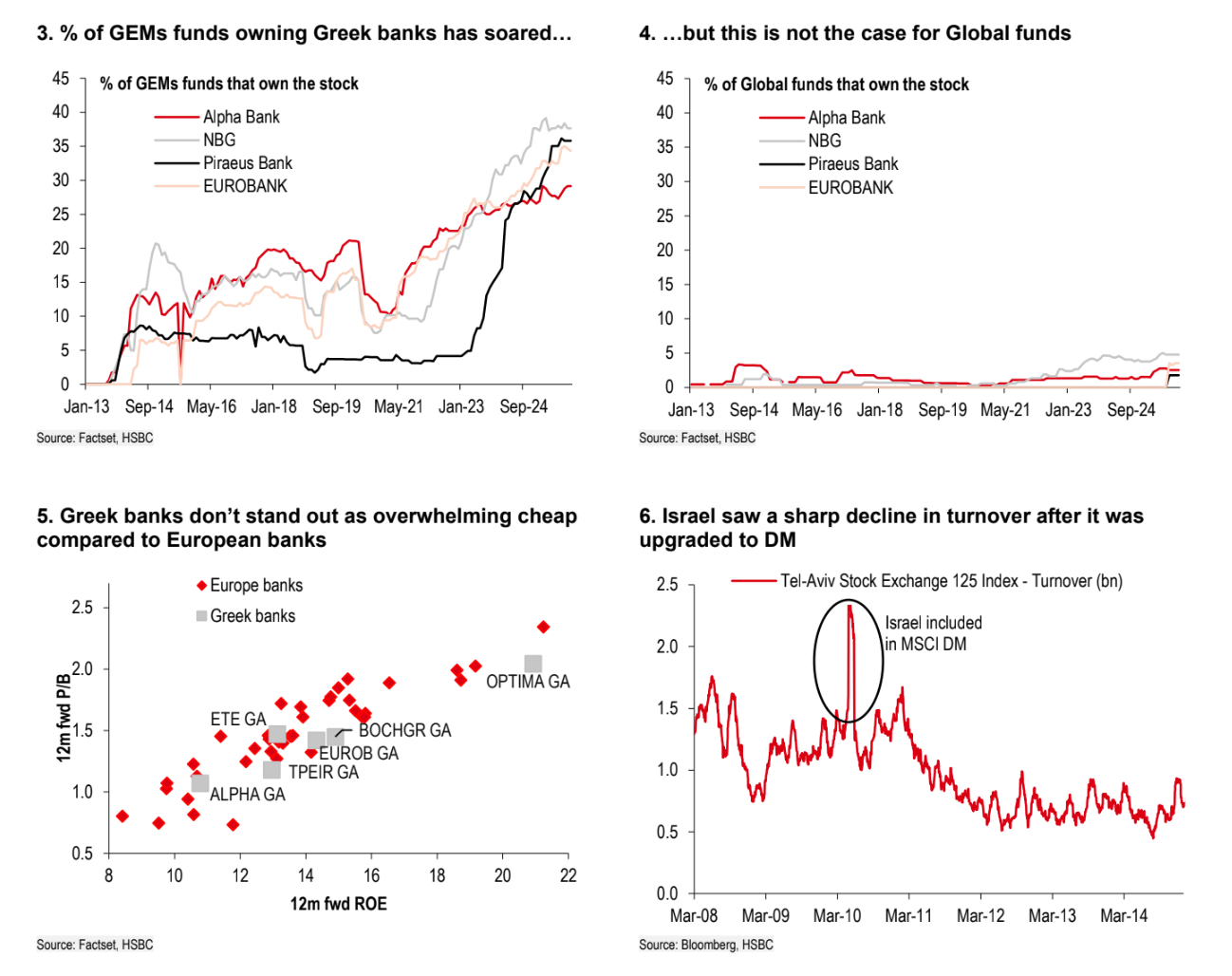 «Οι ανησυχίες γύρω από μια πιθανή αναβάθμιση από τη MSCI αποτέλεσαν έναν από τους λόγους για τους οποίους υποβαθμίσαμε τη στάση μας για την Ελλάδα σε υποεπενδεδυμένη στις αρχές του έτους. Η απόφαση αυτή προκάλεσε αντιδράσεις από πελάτες, με τη συζήτηση να επικεντρώνεται στο κατά πόσο τα κεφάλαια ανεπτυγμένων αγορών θα επενδύσουν ενεργά στην Ελλάδα και ιδίως στις τράπεζες.