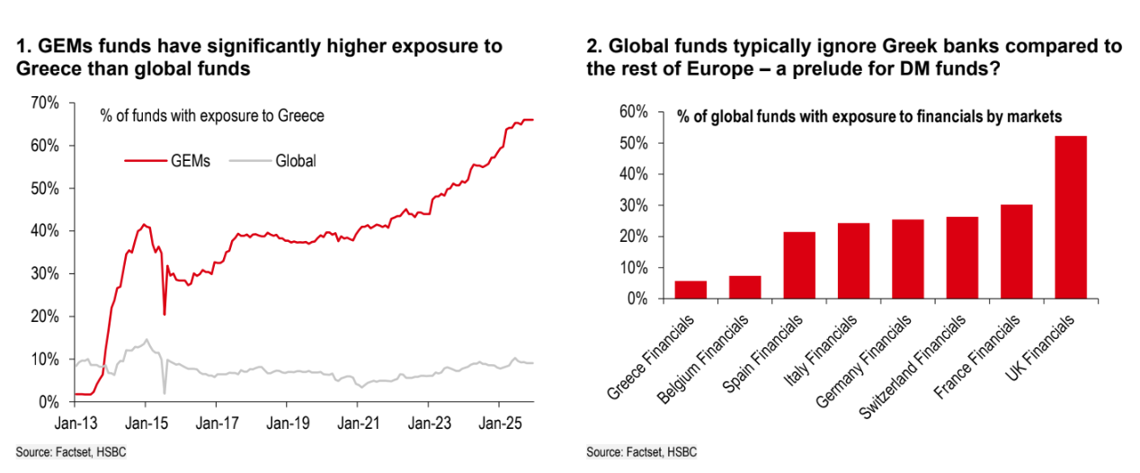 Ενώ περίπου το 60% των κεφαλαίων αναδυόμενων αγορών έχει έκθεση στην Ελλάδα, μόνο το 7% των παγκόσμιων κεφαλαίων διατηρεί αντίστοιχη έκθεση. Για τις ελληνικές τράπεζες ειδικότερα, μόλις το 5% έχει τοποθέτηση. Αντιθέτως, η έκθεση σε χρηματοοικονομικές εταιρείες του Ηνωμένου Βασιλείου (52%), της Γαλλίας (30%), της Ελβετίας (26%), της Γερμανίας (25%), της Ιταλίας (24%) και της Ισπανίας (21%) είναι σαφώς υψηλότερη.