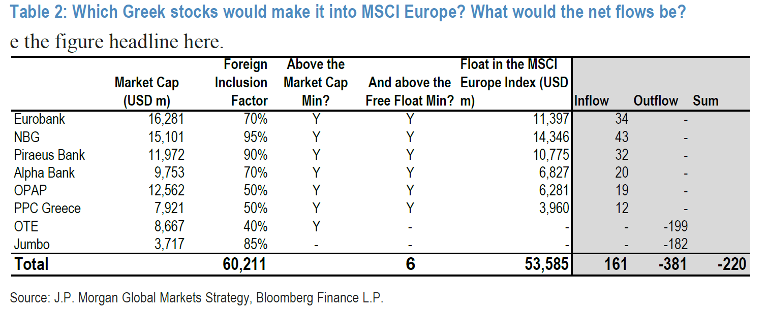 Με βάση τους υπολογισμούς του οίκου, έξι ελληνικές μετοχές, Eurobank, Εθνική, Πειραιώς, Alpha Bank, ΟΠΑΠ και ΔΕΗ, πληρούν τα κριτήρια εισόδου στον MSCI Europe, όμως οι συνολικές καθαρές ροές εκτιμώνται αρνητικές κατά $220 εκατ., καθώς προβλέπονται εισροές $161 εκατ. αλλά εκροές $381 εκατ.