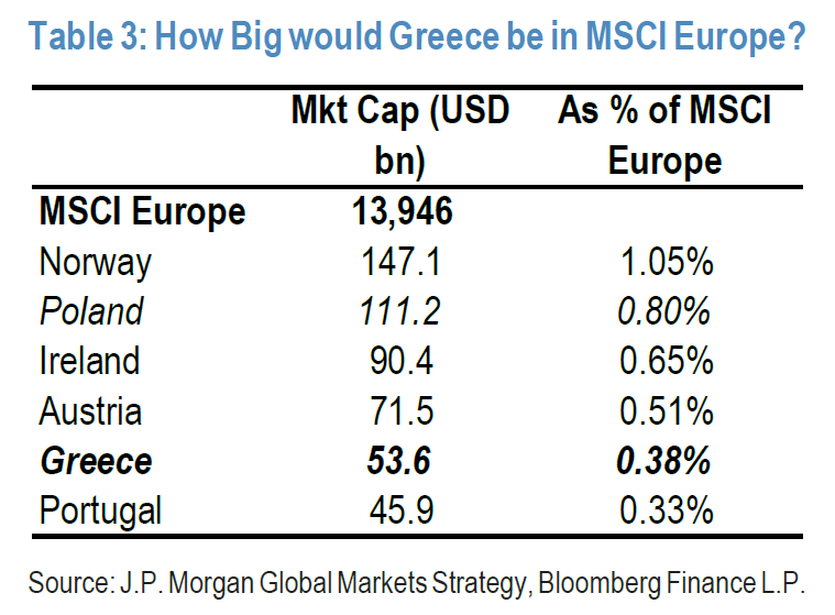 Ο λόγος είναι ότι οι αλλαγές που λαμβάνουν χώρα είναι θεμελιώδεις και διαφοροποιούν τη δομή της αγοράς, καθώς η Ελλάδα περνά από αγορά με σημαντικό βάρος στους αναδυόμενους δείκτες σε εξαιρετικά μικρή στάθμιση στον ανεπτυγμένο κόσμο, με μόλις 38 μονάδες βάσης στον MSCI Europe.