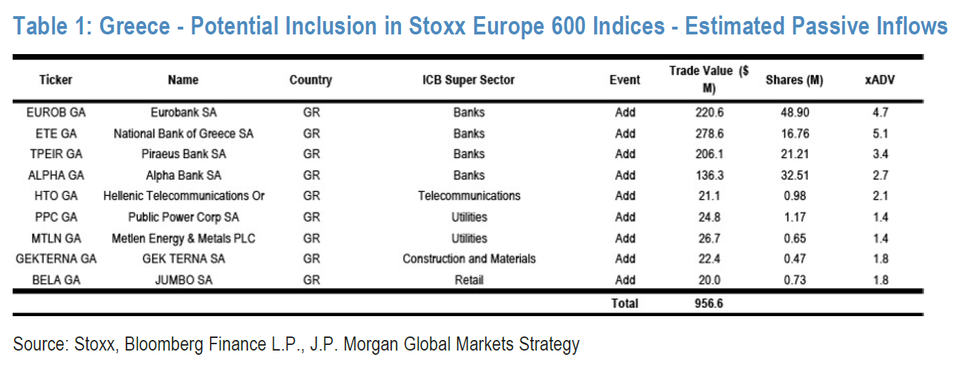 Η αναβάθμιση της Ελλάδας σε αναπτυγμένη αγορά από τον STOXX από τις 22 Σεπτεμβρίου δημιουργεί, κατά την J.P. Morgan και τους David Aserkoff και Inga Galeni (29/4), έναν από τους ισχυρότερους τεχνικούς καταλύτες των τελευταίων ετών για το ελληνικό χρηματιστήριο, με εκτιμώμενες παθητικές εισροές $957 εκατ., εκ των οποίων σχεδόν το 90% κατευθύνεται στις τέσσερις συστημικές τράπεζες.