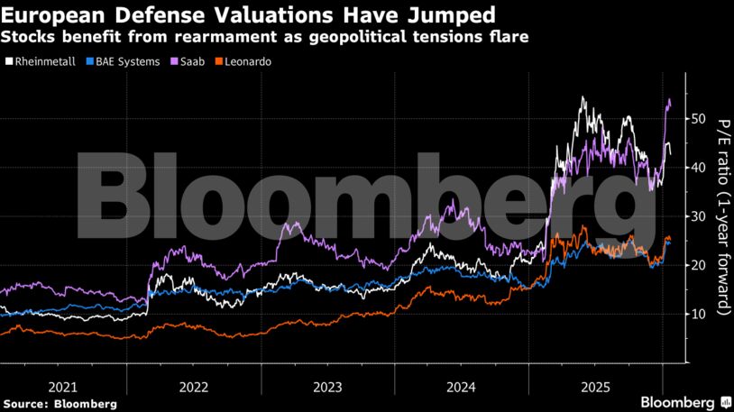 Μετά από μια μαζική άνοδο το πρώτο εξάμηνο του 2025, οι μετοχές του στρατιωτικού τομέα έχουν γίνει όλο και πιο ευαίσθητες στις γεωπολιτικές εξελίξεις, καθώς οι υψηλές αποτιμήσεις τους κρατούν την αγορά σε εγρήγορση. Η μετοχή της Rheinmetall αποτιμάται σε πάνω από 40 φορές τα αναμενόμενα κέρδη σε ένα χρόνο, σχεδόν το διπλάσιο από το πολλαπλάσιο που παρατηρήθηκε πριν από ένα χρόνο.