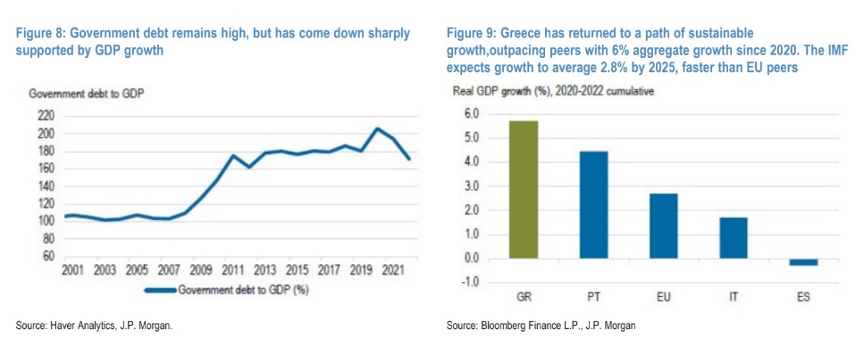 Ως έχει, η Ελλάδα αναμένεται να αναπτυχθεί πάνω από 2%, σημαντικά πάνω από το 0,7% ανάπτυξη για τη ζώνη του ευρώ. Μια ήπια προσγείωση της παγκόσμιας ανάπτυξης για το έτος θα πρέπει να δει τους επενδυτές να προσθέτουν στον κίνδυνο δεδομένης της ανώτερου ρυθμού ανάπτυξης της χώρας από τη στήριξη του προγράμματος ανάκαμψης και του RRF.