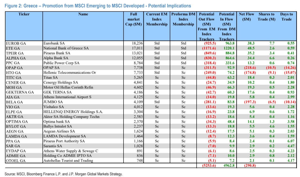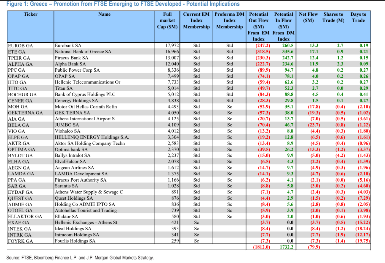 Σύμφωνα με την έκθεση της JP Morgan και τους Min Moon και Pankaj Gupta της ομάδας παραγώγων και ποσοτικής στρατηγικής (10/2), FTSE, MSCI και STOXX οδηγούν την αγορά σε σταδιακή αλλαγή επενδυτών, όπου τα κεφάλαια που παρακολουθούν δείκτες αναδυόμενων αγορών μειώνουν έκθεση και αντικαθίστανται από ευρωπαϊκά και διεθνή χαρτοφυλάκια αναπτυγμένων αγορών.