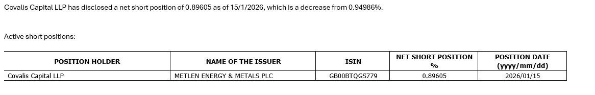 Πιο συγκεκριμένα, η Covalis Capital LLP ανακοίνωσε πως μείωσε την καθαρή αρνητική θέση της (net short position) σε 0,89605% στις 15 Ιανουαρίου 2026, που αποτελεί υποχώρηση από το 0,94986% προηγουμένως.