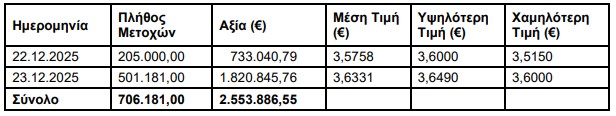 H ΑΛΦΑ ΤΡΑΠΕΖΑ (η ‘Τράπεζα’), σε συνέχεια της από 17.09.2025 ανακοίνωσής της, ενημερώνει ότι, στο Πλαίσιο του Προγράμματος Αγοράς Ιδίων Μετοχών που εγκρίθηκε με την απόφαση της Έκτακτης Γενικής Συνέλευσης των Μετόχων της με ημερομηνία 12.6.2025, κατά το διάστημα 22.12.2025 – 23.12.2025, προέβη σε αγορά μέσω του Χρηματιστηρίου Αθηνών συνολικά 706.181 ίδιων μετοχών, με μέση τιμή κτήσης 3,6165 € ανά μετοχή και συνολικό κόστος 2.553.886,55 €.