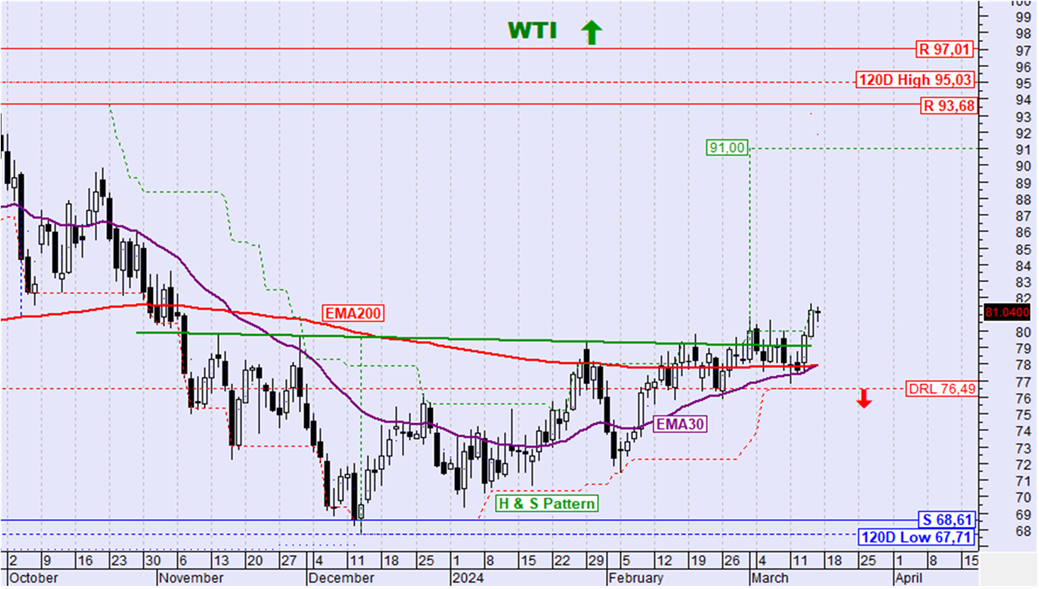Σε κάθε περίπτωση σηματοδότηση για ανατροπή της ανοδικής τάσης θα δοθεί με διάσπαση του ΕΜΑ30 και του ορίου αλλαγής της τάσης σε καθοδική. Μέχρι να συμβεί αυτό παραμένει ενεργός ο σχηματισμός ΩΚΩ καθώς και ο ανοδικός στόχος αυτού στην περιοχή των 91$.