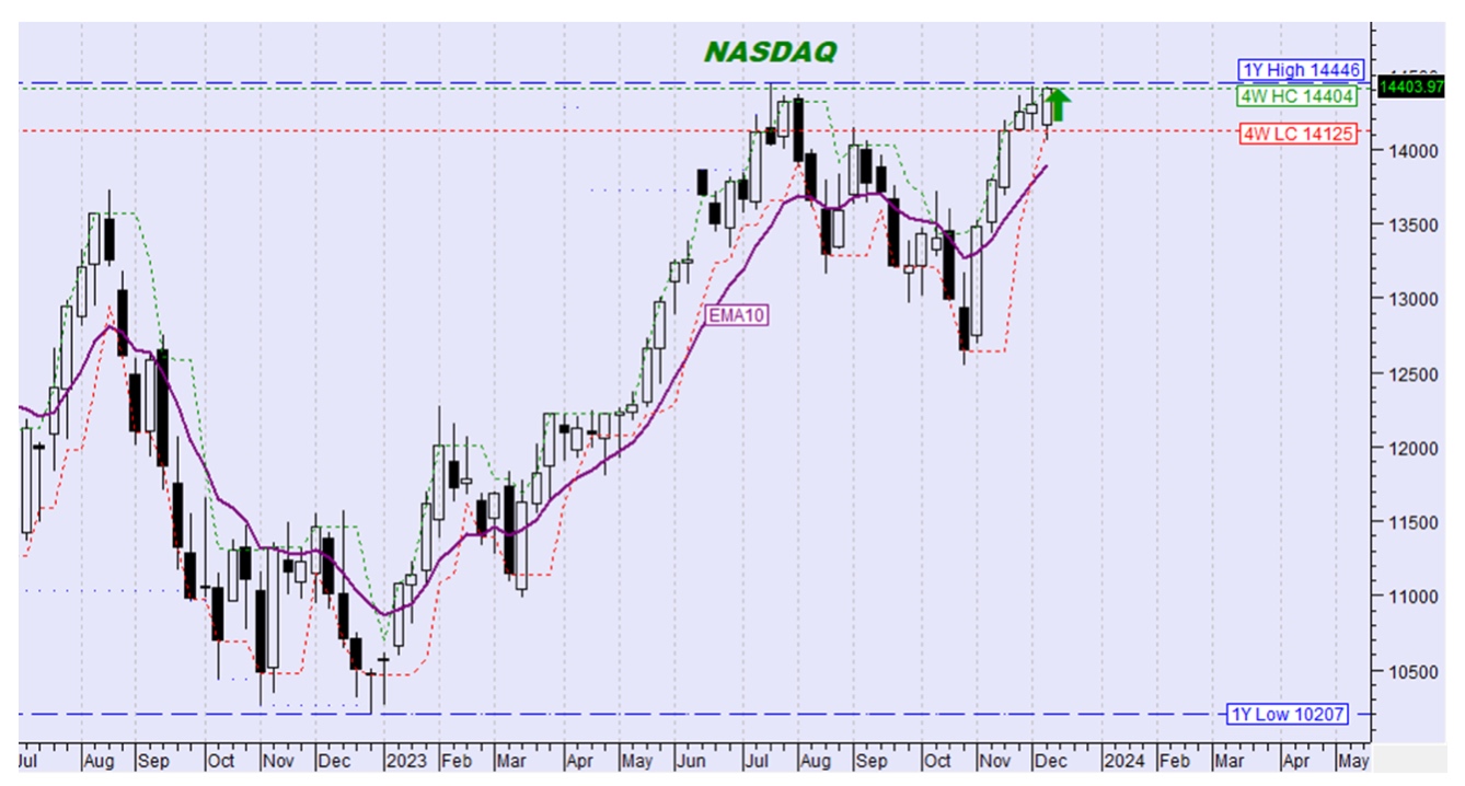 Ο δείκτης συνέχισε με μία ακόμη ανοδική εβδομάδα και πέτυχε νέο υψηλό κλείσιμο 4 εβδομάδων και νέο υψηλό έτους (52 εβδομάδων) στις 4609 μονάδες. Χωρίς μεταβολή στην τάση