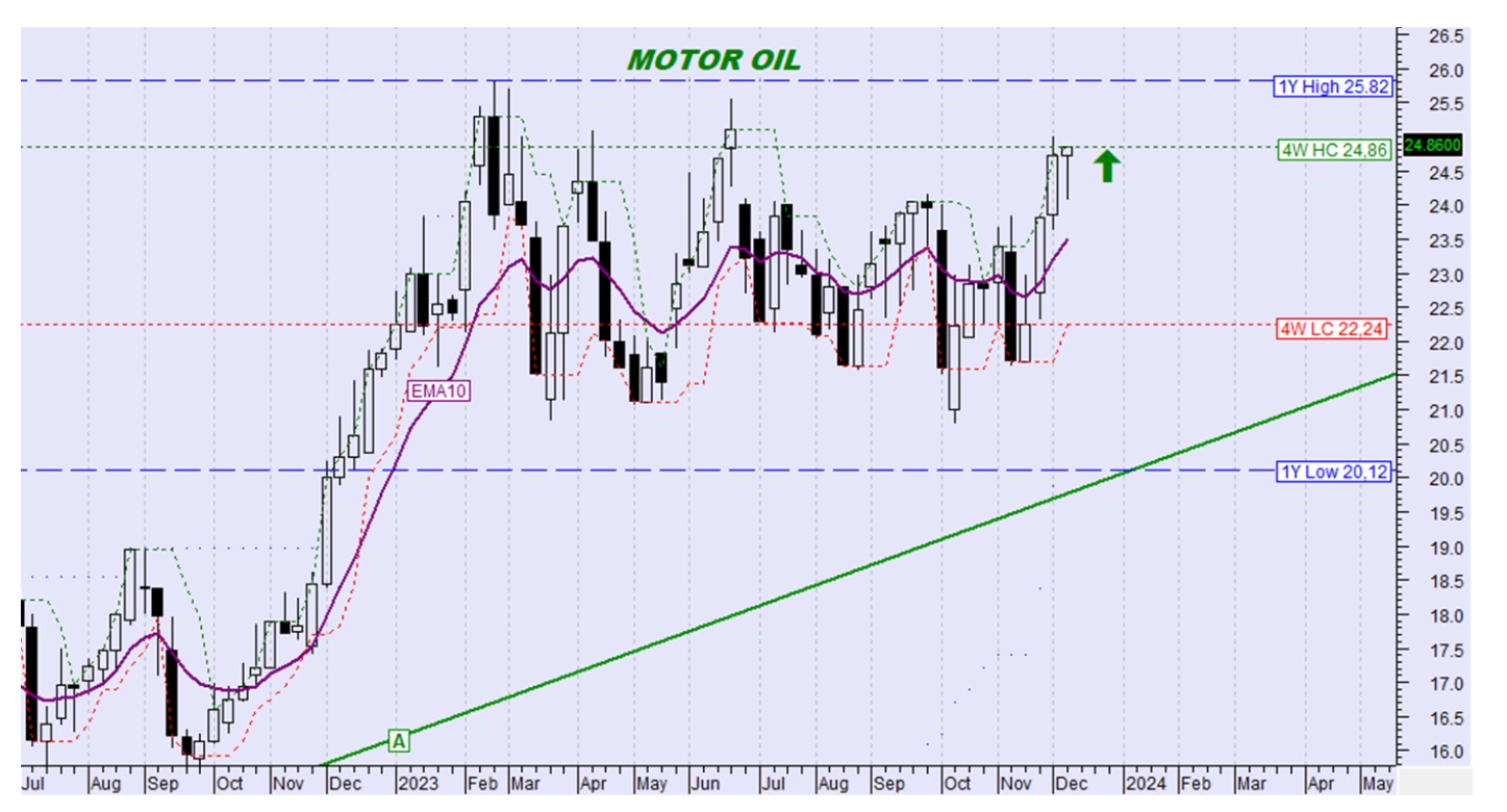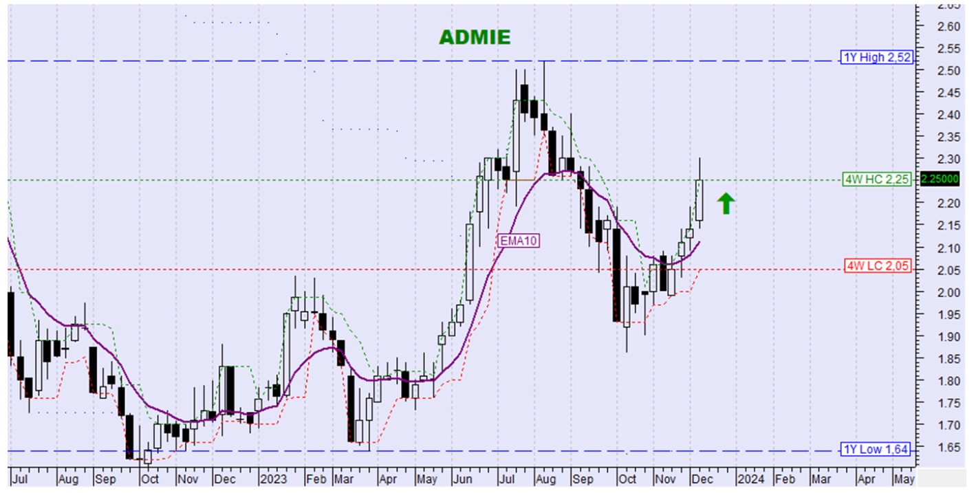 Η μετοχή συνέχισε με μία ακόμη ανοδική εβδομάδα και πέτυχε νέο υψηλό κλείσιμο 4 εβδομάδων. Χωρίς μεταβολή στην τάση.