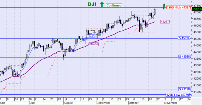 Ο αμερικανικός δείκτης DJI την περασμένη εβδομάδα κινήθηκε ανοδικά και πέτυχε νέο υψηλό 120 ημερών. Ο ΕΜΑ5 διατηρεί την τιμή του ψηλότερα από τον ΕΜΑ30 και έτσι διατηρείται η μεσοπρόθεσμη ανοδική τάση.