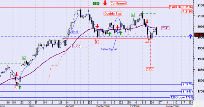 Ο ΓΔ την περασμένη εβδομάδα, κινήθηκε ανοδικά αλλά διατήρησε την τιμή της χαμηλότερα του ΕΜΑ30. Επίσης ο ΕΜΑ5 διατηρεί την τιμή του χαμηλότερα του ΕΜΑ30 με αποτέλεσμα τη διατήρηση της μεσοπρόθεσμης επιβεβαιωμένης καθοδικής τάσης. Παραμένει ενεργός ο σχηματισμός διπλής κορυφής ο οποίος έχει καθοδικό στόχο στις 1850 μονάδες.