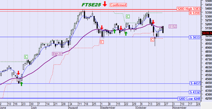 Ο FTSE25 την περασμένη εβδομάδα, κινήθηκε ανοδικά αλλά διατήρησε την τιμή της χαμηλότερα του ΕΜΑ30. Επίσης ο ΕΜΑ5 διατηρεί την τιμή του χαμηλότερα του ΕΜΑ30 με αποτέλεσμα τη διατήρηση της μεσοπρόθεσμης επιβεβαιωμένης καθοδικής τάσης.