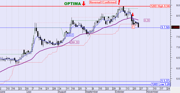 Η μετοχή την περασμένη εβδομάδα κινήθηκε καθοδικά. Ο ΕΜΑ5 διέσπασε καθοδικά τον ΕΜΑ30 ενώ ταυτόχρονα η τιμή διέσπασε και το όριο επιβεβαίωσης αντιστροφής της τάσης με αποτέλεσμα τη σηματοδότηση επιβεβαιωμένης αντιστροφής της μεσοπρόθεσμης τάσης σε καθοδική.