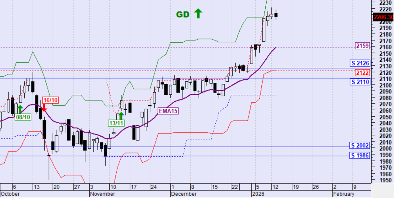 ο Εκθετικός Μέσος Όρος των 15 ημερών (ΕΜΑ15) στις 2159 μονάδες