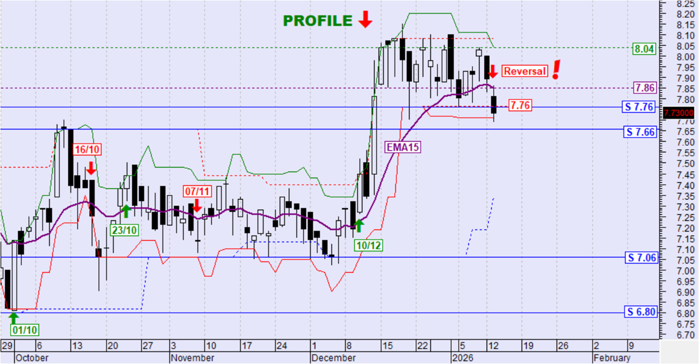 Βραχυπρόθεσμη τάση: αντιστράφηκε σε καθοδική με την καθοδική διάσπαση των 7,76€ στο κλείσιμο