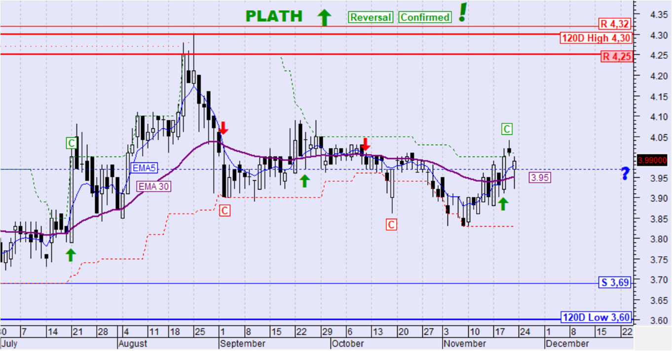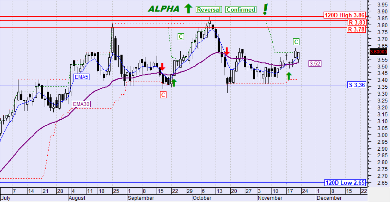 Η τιμή της μετοχής την περασμένη κινήθηκε καθοδικά και πέτυχε την καθοδική διάσπαση του ΕΜΑ30. Ο ΕΜΑ5 διέσπασε καθοδικά τον ΕΜΑ30 ενώ ταυτόχρονα η τιμή διέσπασε και το όριο επιβεβαίωσης αντιστροφής της τάσης με αποτέλεσμα τη σηματοδότηση επιβεβαιωμένης αντιστροφής της μεσοπρόθεσμης τάσης σε καθοδική.