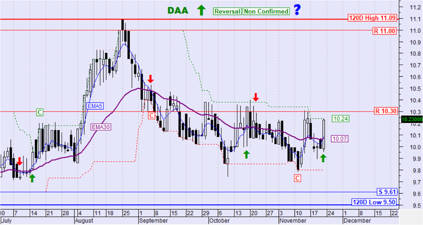 Πέρα από την μεσοπρόθεσμη τεχνική εικόνα ενδιαφέρον έχει και η βραχυπρόθεσμη τάση των μετοχών του καλαθιού παρακολούθησης στο άνοιγμα της εβδομάδας (διαμόρφωση με το κλείσιμο της Παρασκευής 21/11) η οποία είναι όπως στον παρακάτω πίνακα