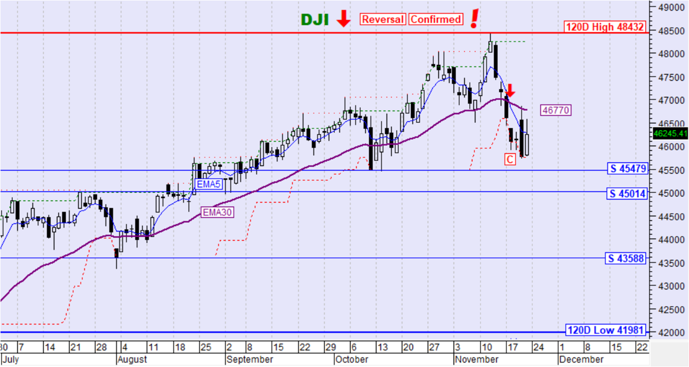 Ο αμερικανικός δείκτης DJI την περασμένη εβδομάδα κινήθηκε καθοδικά και πέτυχε την καθοδική διάσπαση του ΕΜΑ30. Ο ΕΜΑ5 διέσπασε καθοδικά τον ΕΜΑ30 ενώ ταυτόχρονα η τιμή διέσπασε και το όριο επιβεβαίωσης αντιστροφής της τάσης με αποτέλεσμα τη σηματοδότηση επιβεβαιωμένης αντιστροφής της μεσοπρόθεσμης τάσης σε καθοδική.
