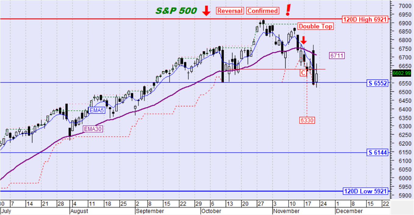 Ο δείκτης S&P500 την περασμένη εβδομάδα κινήθηκε καθοδικά και πέτυχε την καθοδική διάσπαση του ΕΜΑ30. Ο ΕΜΑ5 διέσπασε καθοδικά τον ΕΜΑ30 ενώ ταυτόχρονα η τιμή διέσπασε και το όριο επιβεβαίωσης αντιστροφής της τάσης με αποτέλεσμα τη σηματοδότηση επιβεβαιωμένης αντιστροφής της μεσοπρόθεσμης τάσης σε καθοδική. Παράλληλα ενεργοποιήθηκε μεσοπρόθεσμος σχηματισμός διπλής κορυφής που έχει καθοδικό στόχο στην περιοχή των 6330 μονάδων.