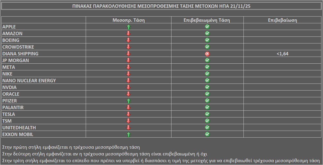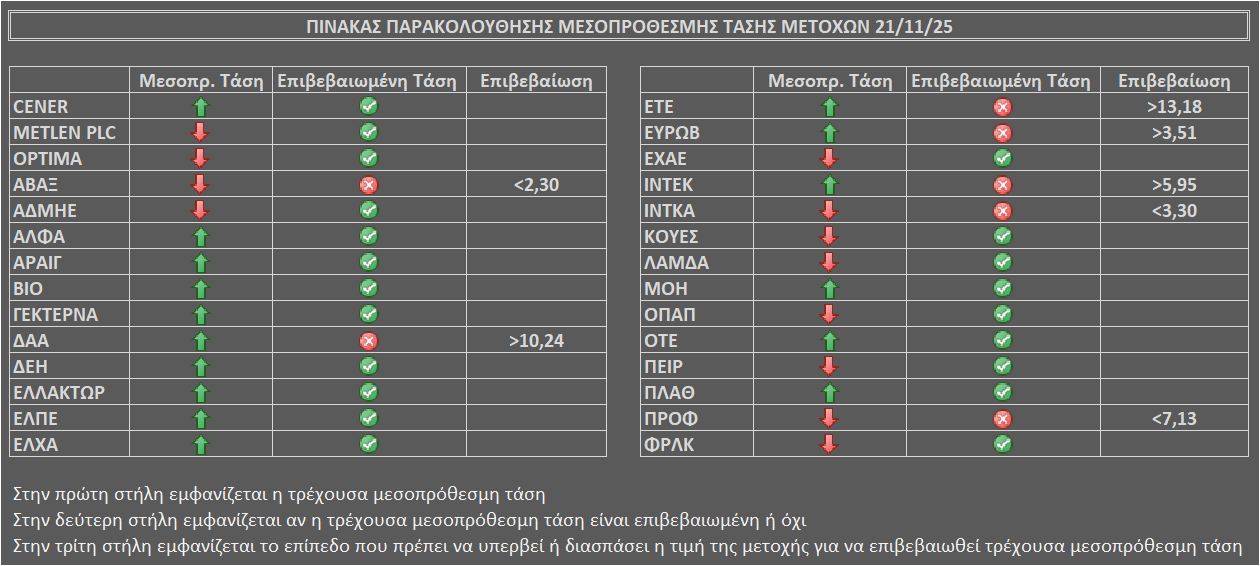 Η μεσοπρόθεσμη τάση των μετοχών του καλαθιού παρακολούθησης στο άνοιγμα της ερχόμενης εβδομάδας (διαμόρφωση με το κλείσιμο της Παρασκευής 21/11) είναι όπως στον παρακάτω πίνακα